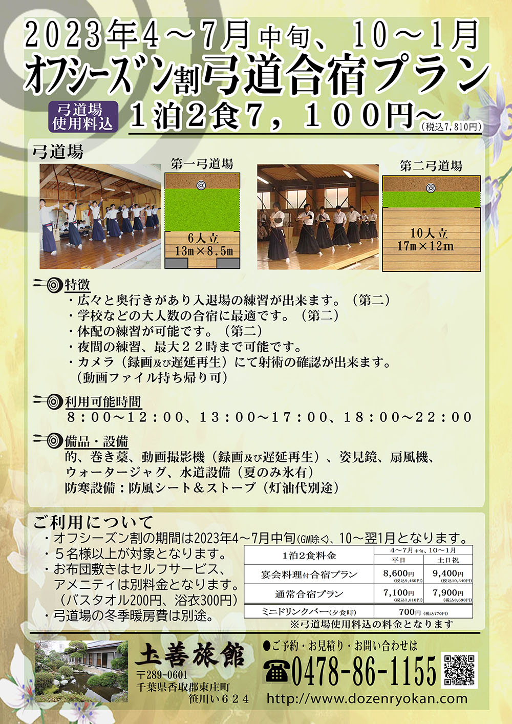 土善旅館の弓道合宿は、大学及び中学、高等学校弓道部、社会人弓道サークル、多くの弓道関係者様を中心に、ご好評いただいております。夏・春の弓道合宿、土日等の短期合宿、オフシーズン時の平日などに、当館での弓道合宿はいかがでしょうか。